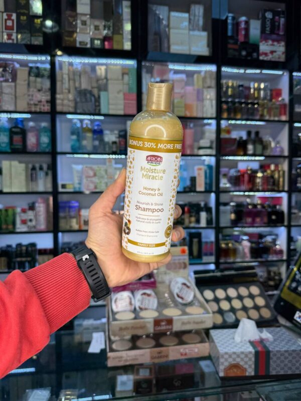 شامپو مخصوص موهای فر و حالت دار افریکن پراید (MOISTURE MIRACLE HONEY & COCONUT OIL Shampoo)، با سرشار بودن از شی باتر یکی از بهترین گزینه ها برای شستن موها می باشد. این فرمول پاک کننده ملایم کثیفی و تجمع مواد روی مو را بدون پاک کردن روغن طبیعی مو از بین می برد. موهای ضخیم و خشک را تمیز، مرطوب و نرم می کند همچنین درخشندگی و کنترل پذیری را افزایش می دهد.