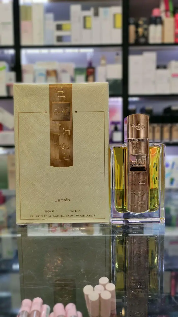 عطر انغام لطافه Lattafa Angham مشابه عطر باربری گادس Burberry Goddess عطری است که با رایحه گرم و شیرین، زنانه و شیک.و در دسته عطر های رایحه های معطر قرار می گیرد. از ویژگی های این عطر رایحه بسیار دلنشین و گرم آن می باشد و در دسته عطر های رایحه های معطر قرار می گیرد. از ترکیبات بکار برده شده در این عطر می توان به وانیل ، اسطوخودوس ، وانیل اشاره کرد.